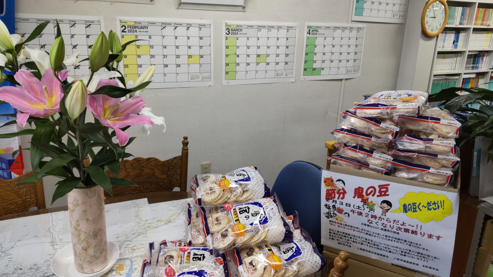 恒例の中村屋さんの揚げたてコロッケ&ミンチカツ2千個にはかなわないですが、いつもの数をそろえて子供たちの「鬼の豆!ください!」の元気な声を待っております。