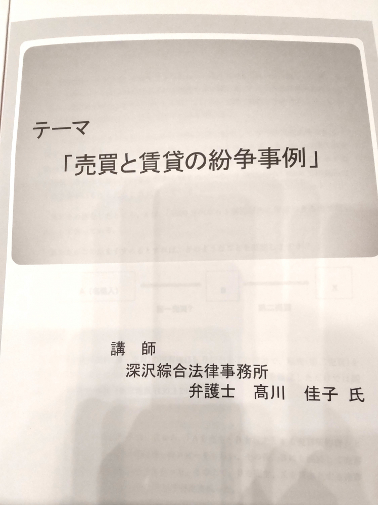 また、髙川先生は不動産業者が訴えられないためだけとか不動産業者が責任回避できるとかではなく、売主・買主・貸主・借主を含めて関係者がトラブルにならない方策を考えられ、われわれ不動産業者が実際に使用する契約書をたえず更新してくださっているのがありがたい。不動産業者の一員として実務上、髙川先生の「お世話にならない」様に日々努力していかなくてはならないと深く誓った研修会だった。